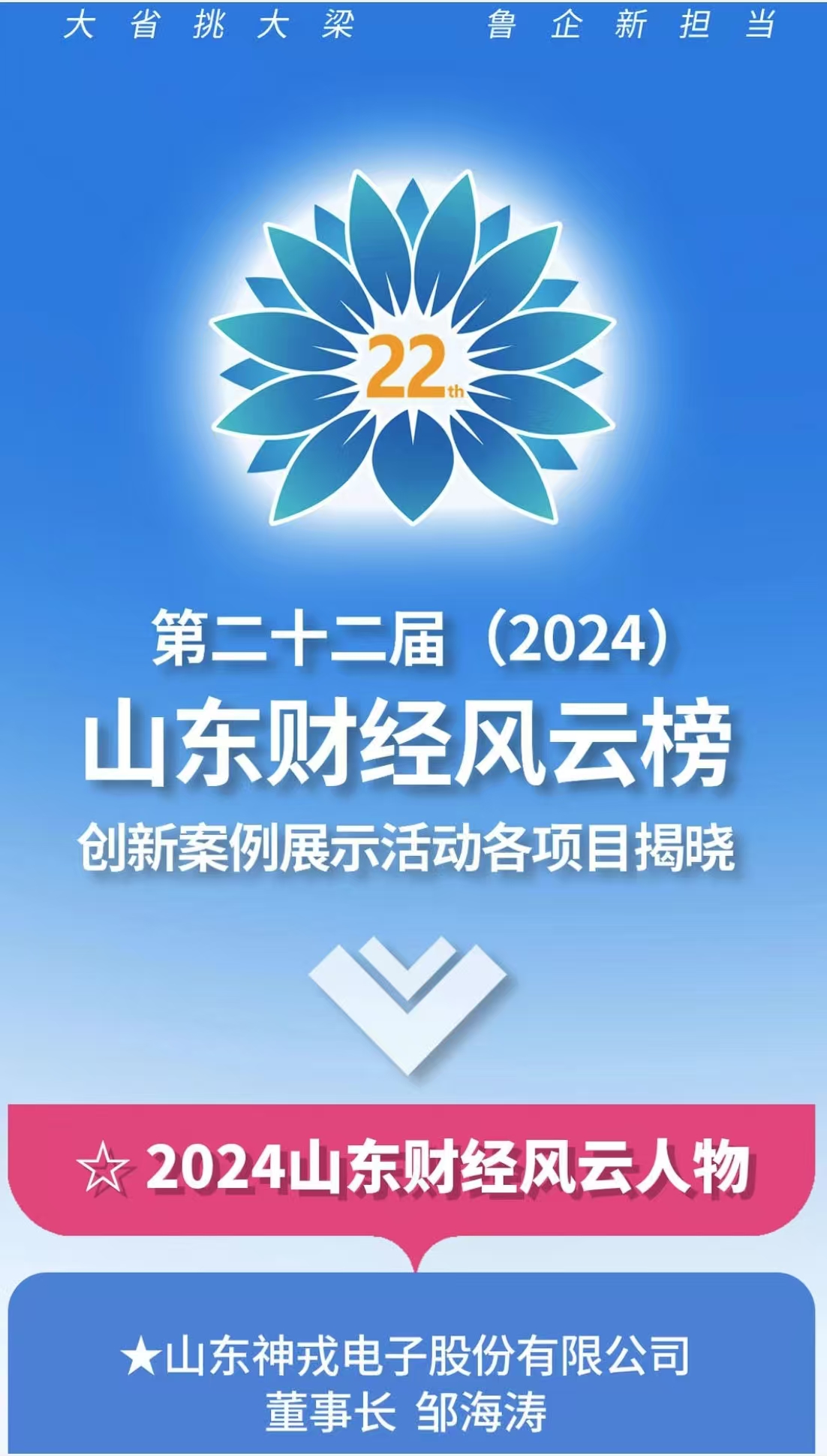 鄒海濤董事長(zhǎng)榮獲“第二十二屆(2024)山東財(cái)經(jīng)風(fēng)云人物”[ 更多 ]